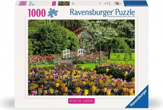Cufundați-vă în paleta bogată de lalele, lacul liniștit și podețul pitoresc – o imagine care înfrumusețează orice după-amiază de relaxare și vă îmbie să continuați asamblarea.