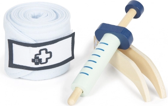 Seringa are piston mobil, iar bandajul se închide cu scai. Copiii se bucură de un joc mai realist și, în același timp, își antrenează motricitatea fină.