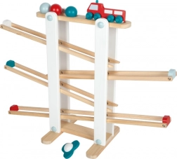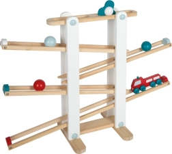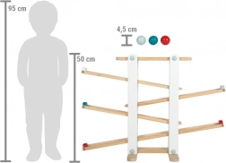 Această pistă mare din lemn pentru bile Small Foot le oferă copiilor surprize continue și bucuria de a urmări bilele și mașinuța cum coboară de la un nivel la altul. Lemnul natural, combinat cu culori vibrante, are un aspect modern și atemporal, integrându-se perfect în orice cameră de copil. Execuția stabilă din lemn masiv garantează durabilitate și joacă sigură.