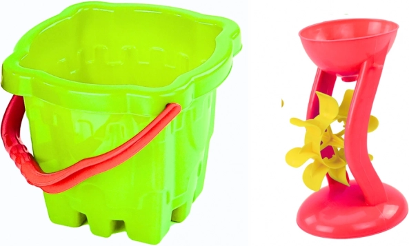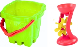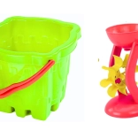 - Găleată în formă de castel, moară de nisip, lopățică, greblă, 4 forme, sită