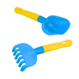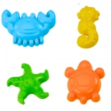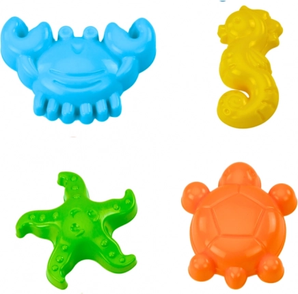 Lopățica și grebla ergonomice se potrivesc mâinilor copiilor. Setul de patru forme (crab, stea de mare, căluț de mare, țestoasă) stimulează imaginația.