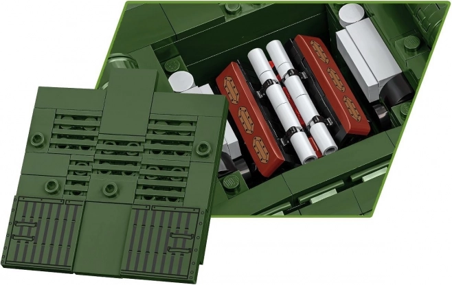 Turela este rotativă, țeava se ridică și coboară, iar șenilele se rotesc odată cu mișcarea modelului. Sub turelă, care poate fi îndepărtată, găsești o reprezentare a interiorului, iar sub capacul de service poate fi amplasat modelul motorului W-11. Imprimeurile periscopelor și ale altor detalii accentuează autenticitatea. Setul este pe deplin compatibil cu alte mărci de cărămizi de construcție.
