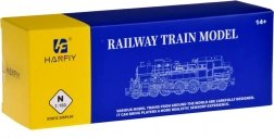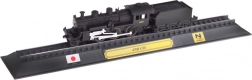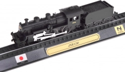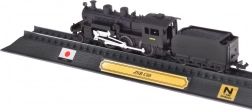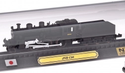 Model detaliat al locomotivei cu abur JNR C50 la scara 1:160, cu elemente realiste ale caroseriei și șasiului pe o bază cu șine.