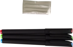 Setul include 3 markere colorate și plastilină care fixează șabloanele de hârtie. Astfel se previne alunecarea și se asigură linii curate, fără pete.
