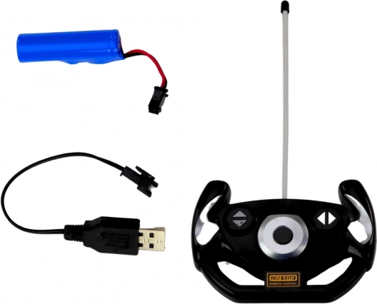 Telecomanda în formă de volan cu butoane și antenă metalică pentru o manevrabilitate mai bună a jucăriei.