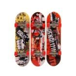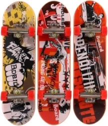 Skateboard compact, cu grafică detaliată și truck-uri solide, imită mersul real în format mini.