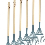 Greblă ușoară și rezistentă pentru copii, în nuanță modernă de albastru fumuriu, care facilitează primele lor pași în grădinărit. Datorită mânerului din lemn și capului metalic, este robustă, dar ideal echilibrată pentru copii. Micii grădinari pot aduna cu ușurință frunze, iarbă și crenguțe subțiri, iar după lucru o pot agăța simplu de cureaua practică.