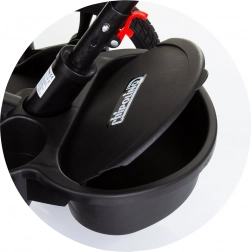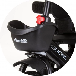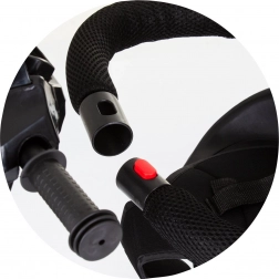 Siguranța este asigurată de centuri în 5 puncte cu pernuțe pentru umeri, bară de protecție, apărătoare la roata din față împotriva prinderii piciorușelor și frâne de picior pe roțile din spate. Echiparea practică include coș frontal și posterior, geantă pentru accesorii pe bara de ghidare și ghidon cu muzică și lumină (2× AA, 1,5 V).