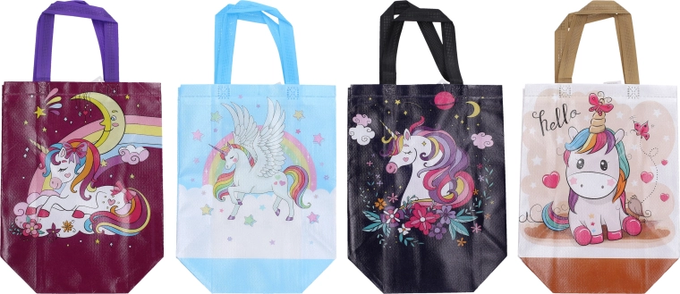 Pungă cadou pentru copii, stilată, din țesătură netesută de calitate, mărimea M, care va bucura orice mic sărbătorit. Este ușoară, rezistentă și reutilizabilă, ideală pentru zile de naștere, sărbători și mici cadouri. Disponibilă în 4 modele vesele și cu mânere practice pentru purtare confortabilă.