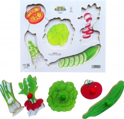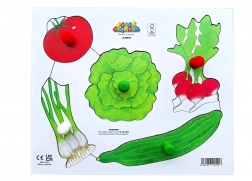 Acest puzzle din lemn oferă copiilor posibilitatea de a învăța să recunoască diferite tipuri de legume. Peguri pe piese permit o prindere și manipulare facilă.