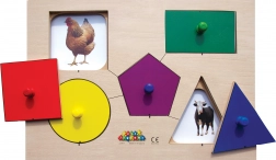 Acest puzzle din lemn este unic prin educativitatea și aspectul său distractiv. Conține 5 deschideri geometrice pentru piese colorate, care au mânere pentru o prindere confortabilă.