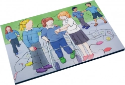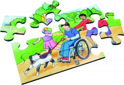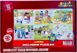 Descoperiți puzzle-ul educativ cu 72 de piese care ilustrează scene ce includ persoane cu dizabilități în activități obișnuite. Fiecare imagine promovează ideea de integrare și ajutor reciproc. Aceste puzzle-uri ajută copiii să înțeleagă egalitatea, empatia și să respecte diferențele celorlalți.