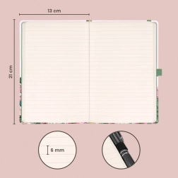 Carnet de notițe liniat Notique Kakadu, dimensiuni 13 × 21 cm, cu coperți rigide, închidere cu elastic, buclă pentru pix și buzunar interior. Oferă 172 de pagini pe hârtie galbenă pentru ideile tale, jurnal și notițe de lucru.