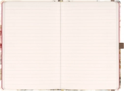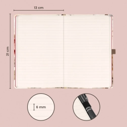 Carnetul de notițe NOTIQUE, elegant, cu motiv de flori pudrate, în formatul practic 13 × 21 cm, oferă 172 de pagini punctate pe hârtie galbenă, coperți rigide, închidere cu elastic, buclă pentru pix și buzunar interior – ideal pentru jurnal, notițe și planificare.