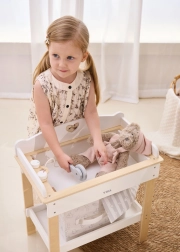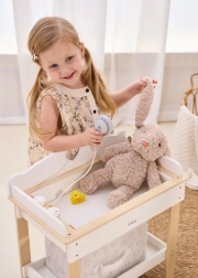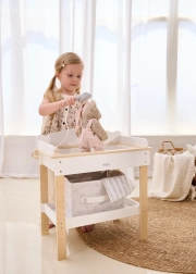 Construcția rezistentă din lemn asigură o joacă sigură și stabilă. Tonurile naturale și albe, minimaliste, se potrivesc ușor într-un interior modern. Setul este ideal pentru role-play, susține motricitatea fină, empatia și responsabilitatea în îngrijirea păpușilor de până la 43 cm.