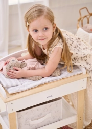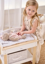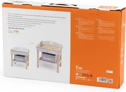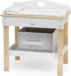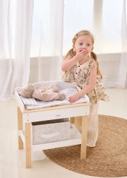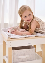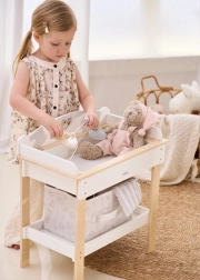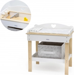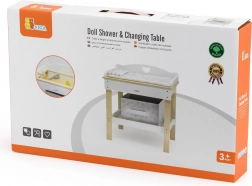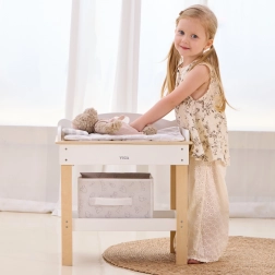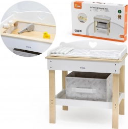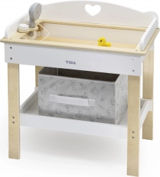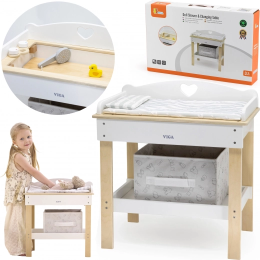 Acest set multifuncțional de la VIGA le permite copiilor să se joace realist de-a îngrijirea bebelușului. Blatul superior servește ca blat de înfășat confortabil; după îndepărtarea lui, se transformă într-o cădiță cu para de duș pentru ritualurile de băiță ale păpușilor. Polița de jos cu coș textil păstrează toate accesoriile la îndemână și bine organizate.