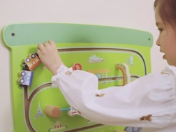 Trenulețul interactiv de perete transformă orice cameră într-un centru educațional jucăuș. Trei panouri separate se montează ușor pe perete și economisesc spațiu, în timp ce culorile vii și elementele tactile invită la explorare. Copiii își exersează priza, coordonarea mână–ochi și înțelegerea cauzei și efectului, totul în siguranță datorită finisajului precis din lemn și vopselelor netoxice.