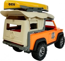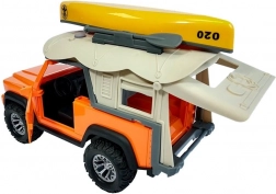 Set de aventură pentru micii călători: o mașină de teren JEEP robustă, cu efecte de lumină și sunet, uși și hayon deschizibile, anvelope din cauciuc și suport pe acoperiș pentru transportul caiacului cu pagaie. Jucărie ideală pentru copii de la 3 ani, care dezvoltă imaginația și dragostea pentru natură.