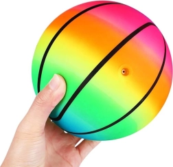Mingea de cauciuc pentru copii, cu diametrul de aproximativ 23 cm, este ideală pentru joaca zilnică în parc, în grădină, la școală sau în vacanță. Datorită construcției ușoare, se aruncă și se prinde cu ușurință, iar culorile curcubeu asigură vizibilitate excelentă și bucuria mișcării. Materialul este rezistent la apă, astfel încât vă veți bucura de distracție și lângă apă sau în piscină.