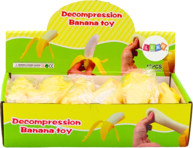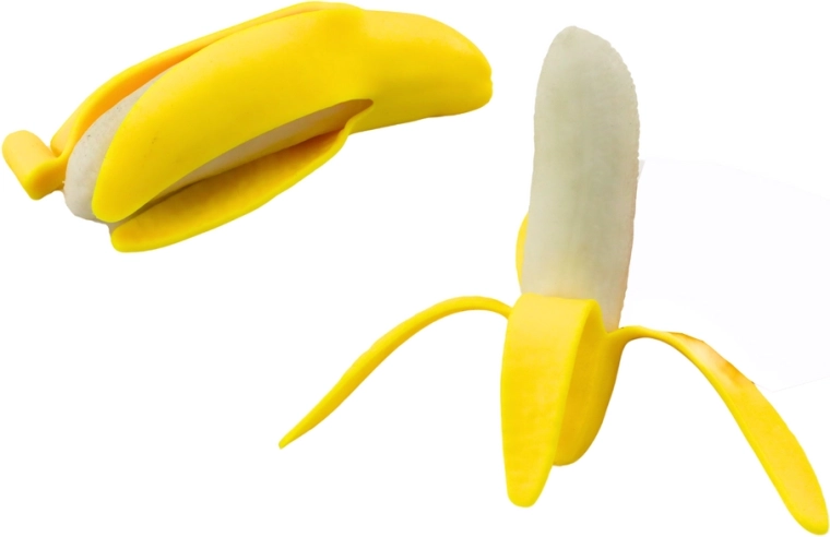 Coaja galbenă, deschisă la capăt, dezvăluie pulpa deschisă la culoare a bananei din interior, care poate fi strânsă, apăsată și întinsă. Materialul de strâns este extrem de elastic și rezistent, asigurând că jucăria revine la forma inițială chiar și după utilizare intensă.