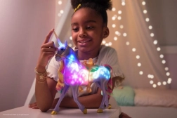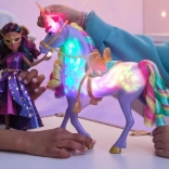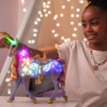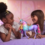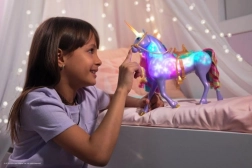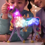 Unicornul luminos reacționează la atingere cu efecte de lumină interactive care creează o experiență curcubeu.