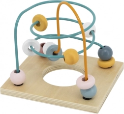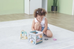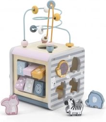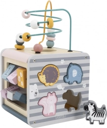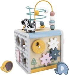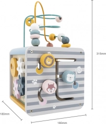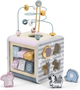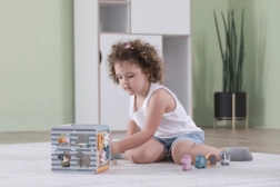 Labirint cu mărgele, labirint glisant cu animăluțe, roți dințate, sortator de forme cu animale și cuburi numerice rotative – totul pentru o dezvoltare complexă.