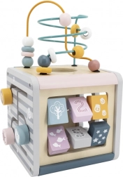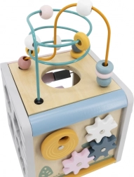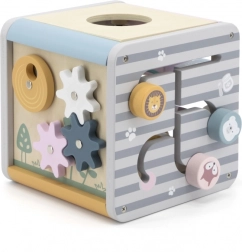 Pe partea superioară găsești un labirint din sârmă cu mărgele pentru dezvoltarea motricității fine și a răbdării. Pereții laterali includ sortator cu animale, cuburi rotative cu numere pentru primele calcule, roți dințate pentru înțelegerea cauzei și efectului și elemente glisante pentru antrenarea coordonării.