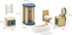Mobilierul miniatural este dimensionat pentru căsuțele standard; piesele individuale se aranjează ușor. Dimensiuni orientative: chiuvetă 3 × 3 × 6 cm, dulăpior 2 × 3 × 2,8 cm, duș 4 × 4,5 × 7,22 cm.