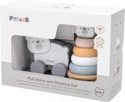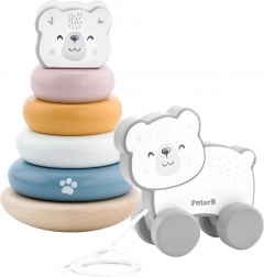 Descoperă setul perfect asortat de jucării din lemn Viga PolarB: o piramidă cu urs polar stabilă pentru sortarea și aranjarea inelelor și un ursuleț de tras care îi motivează pe cei mici la mișcare și la primii pași. Culorile pastel delicate și designul drăguț îi vor încânta pe copii și pe părinți.