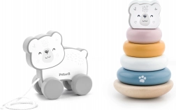 Jocul cu piramida dezvoltă logica, răbdarea și recunoașterea culorilor, în timp ce ursulețul de tras susține în mod natural mersul și abilitățile de coordonare. Ambele jucării sunt realizate din lemn de calitate, cu margini netede pentru o utilizare în siguranță.