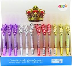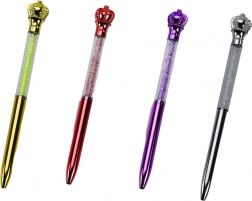 Pix cu bilă elegant, cu coroniță decorativă și corp transparent plin cu pietricele strălucitoare. Oferă cerneală albastră, vârf de 0,7 mm pentru scriere lină și un aspect luxos pentru utilizare zilnică sau ocazii de cadou. Disponibil în mix de culori.