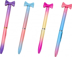 Un pix cu bilă stilat, cu fundiță decorativă, care îmbină eleganța și funcționalitatea. Are un corp colorat, scrie cu cerneală albastră cu vârf de 0,7 mm și este ideal atât pentru scrisul zilnic, cât și pentru cadouri. Culoarea corpului este aleasă aleator.