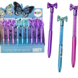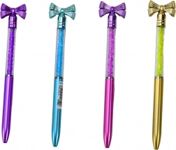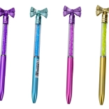 Elegant pix cu bilă, decorat cu o fundiță și cu corp transparent umplut cu cristale sclipitoare, oferă scrisului un farmec aparte. Are cerneală albastră, vârf de 0,7 mm pentru o scriere lină și este disponibil într-un mix de culori – mov, turcoaz, roz și auriu.