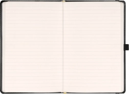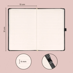 Caiet de notițe elegant NOTIQUE cu coperți rigide, elastic de închidere, buclă pentru pix și buzunar interior. Oferă 172 de pagini pe hârtie galbenă plăcută pentru toate ideile, însemnările de jurnal și notițele de lucru. Dimensiunea compactă 13 × 21 cm încape în geantă și rucsac.