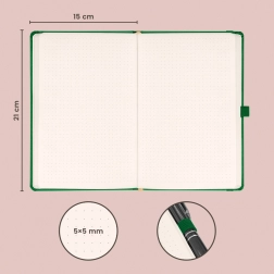 Caietul stilat punctat NOTIQUE Aprint, în eleganta culoare verde, este ideal pentru notițe zilnice, planificare și schițe creative. Oferă un grid punctat pentru scriere și desenare precise, format 15 × 21 cm pentru transport comod și suprafață potrivită pentru embosarea logo-ului cu textură fină.