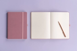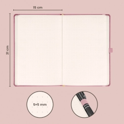 Carnețelul stilat punctat Notique Aprint Neo, în culoare roz, este ideal pentru notițe, schițe și bullet journal. Oferă un finisaj elegant cu textură fină, pe care se poate aplica ușor ștanțarea logo-ului companiei, și un format practic de 15 × 21 cm pentru utilizare zilnică.