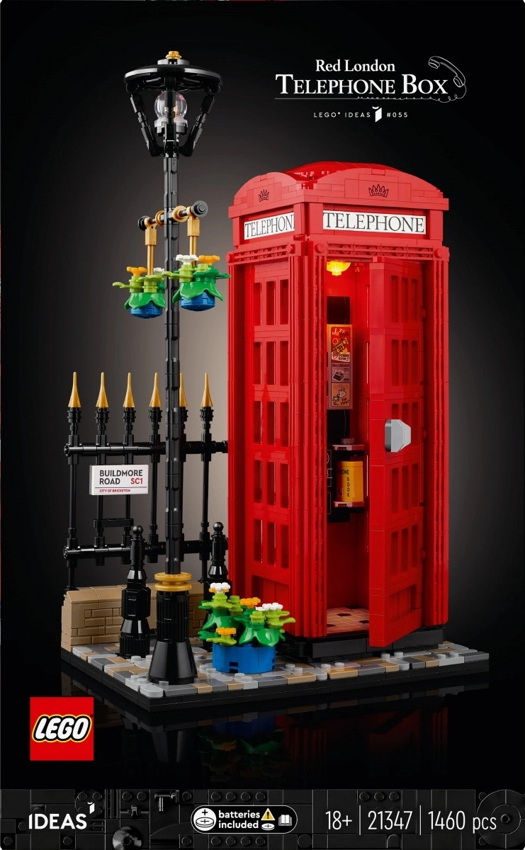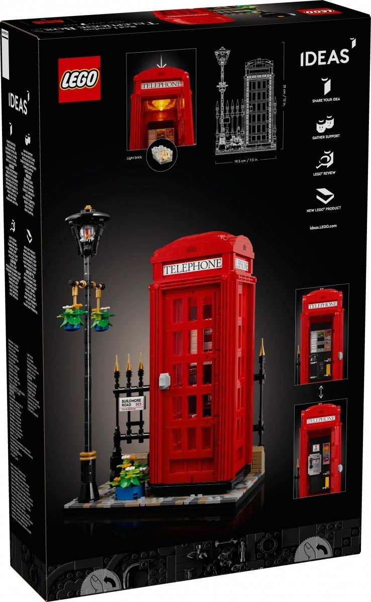 LEGO Ideas Cabină Telefonică Roșie din Londra este un set creativ care redă fidel clasica cabină telefonică britanică K2. Modelul include o cărămidă LEGO luminoasă pentru iluminarea interiorului, oferind o atmosferă autentică. Cu opțiunea de a alege între un telefon retro sau stilul anilor ’80, interiorul poate fi personalizat conform preferințelor personale.