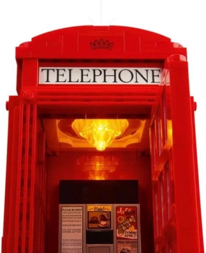 Modelul oferă opțiuni pentru interior: alege telefonul clasic cu cadran rotativ sau varianta în stilul anilor ’90. Prin apăsarea acoperișului, activezi cubul luminos care evidențiază detaliile din interior. Datorită construcției bine gândite, cabina servește și ca suport practic pentru telefon.