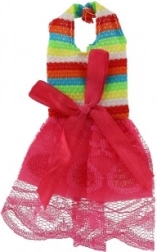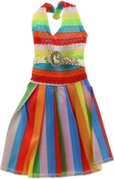 Rochia colorată cu dungi curcubeu oferă o combinație unică de eleganță și joc de culori, ideală pentru momente cotidiene sau festive.
