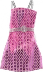 Rochia roz cu o curea strălucitoare argintie și bretelele oferă păpușii un aer de lux și stil.