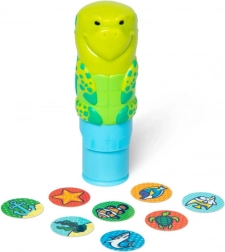 Setul include tot ce este necesar pentru a începe imediat o expediție subacvatică. Ștampila cu țestoasa zâmbitoare și trei sute de autocolante ilustrează pe viu plantele marine, coralii și peisajele subacvatice. De asemenea, include o carte cu 24 de pagini cu fundaluri colorate ce ilustrează oceane, recife de corali, plaje și alte scenarii acvatice pentru a crea povești.