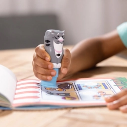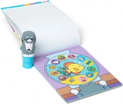 Bucurați-vă de posibilitățile infinite cu setul nostru: ștampilă în formă de pisică gri cu botic alb și nas roz, modul inserabil cu 300 de autocolante cu tematică de animale și carte colorată de 24 de pagini destinată creării propriei povești cu animale.