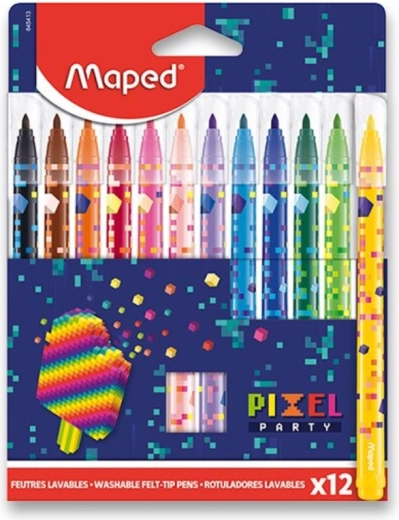 Set vesel cu 12 markere colorate MAPED Pixel Party, care oferă culori intense și un design distractiv inspirat de codurile jocurilor. Markerele au capac respirabil pentru utilizare în siguranță, vârf rezistent la apăsare și cerneală lavabilă, ușor de îndepărtat de pe majoritatea textilelor. Lățimea liniei de 2,8 mm este ideală pentru desen, colorat și proiecte școlare.