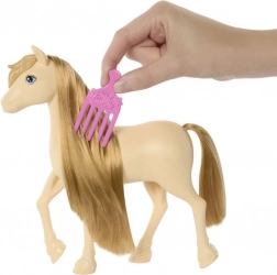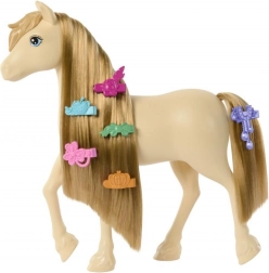 Căluțul are un corp realizat cu detalii și stă într-o mers stilizat, ceea ce îl face o piesă superbă pentru colecția copiilor. Joaca cu părul dezvoltă motricitatea fină, creativitatea și imaginația. Se poate combina cu păpuși și alte accesorii din lumea Barbie (se vând separat).