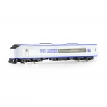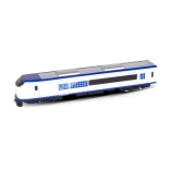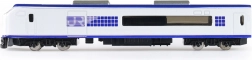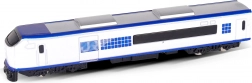 Execuția albă cu detalii albastre și linii curate evidențiază aspectul modern al locomotivei – ideală pentru joacă sau expunere.