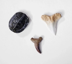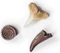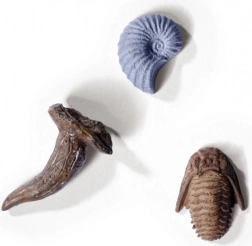 Replici fosile în setul care prezintă forme biologice istorice, inclusiv dinți și fosile spiralate.