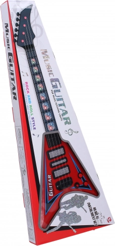 Această chitară electrică este ideală atât pentru muzicienii începători, cât și pentru cei avansați datorită dimensiunilor de 22x5x56 cm. Are efecte de lumină și sunet, care creează o experiență unică în timpul interpretărilor. Alimentată de trei baterii 3xAA, care nu sunt incluse în pachet, și ușor de controlat datorită comutatorului ON/OFF de lângă potențiometre. Ambele potențiometre servesc pentru controlul efectelor.