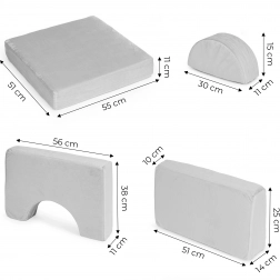 Setul include opt perne cu forme diferite, din care copiii pot construi un fotoliu, o canapea, o căsuță sau chiar un traseu cu obstacole. Susține creativitatea și motricitatea fină.