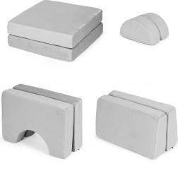 Fotoliul modular pentru copii îmbină confortul, funcționalitatea și joaca creativă. Opt piese cu forme diferite, din spumă moale și elastică, se rearanjează ușor și se adaptează nevoilor curente – de la relaxare la citit până la construirea de căsuțe și obstacole.