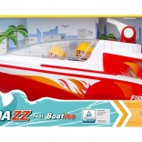 Setul de pompieri BOAZZ aduce o misiune dinamică de salvare pe apă, pe înțelesul copiilor. Barca rapidă roșu-alb cu imprimeuri detaliate „Fire Fighter” și catamaranul stilat formează un duo perfect pentru acțiuni de salvare pe apă. Canonul de apă funcțional permite stropirea reală cu apă, sporind distracția și realismul jocului.